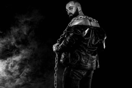Man suppressing anger. Sexy fashion portrait of a hot male model in stylish leather jacket with accessories, muscular body posing in studio. Masculinity concept.