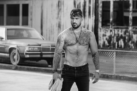 Sexy man outdoor. Brutal angry gang man lifestyle. Serious handsome guy. Strong muscular male body, muscles guy. Tattooed hipster on the street. Handsome confident stylish hipster latin model.
