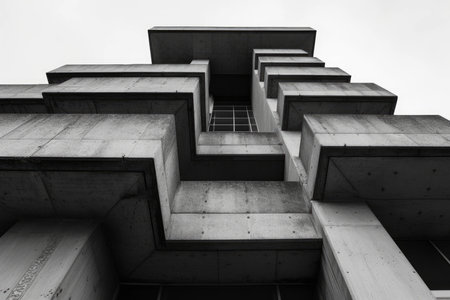 Upward view of a brutalist buildings geometric structure, captured in black and white