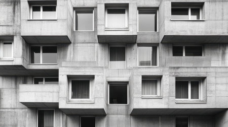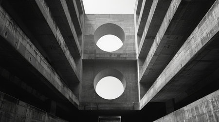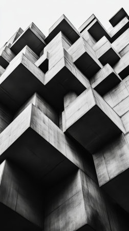 Brutalist architecture with geometric concrete structures, black and white abstract urban concept