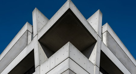 Close-up view of a contemporary brutalist building with stark lines and geometric shapes
