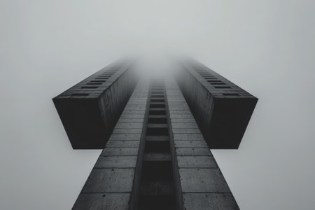 A tall concrete structure stands in the fog, creating a mysterious and dramatic atmosphere.