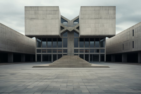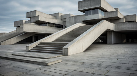 Brutalist university building with raw concrete facade, strong geometric lines, and minimalist landscaping under moody skies. A striking example of mid-20th-century architecture