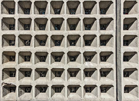 The image showcases an abstract view of a concrete wall featuring square cutouts that create a unique interplay of light, shadow, and texture.