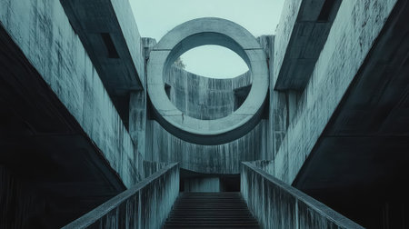 A striking concrete structure featuring round openings and sharp angles, embodying contemporary brutalism with an artistic balance of form and function