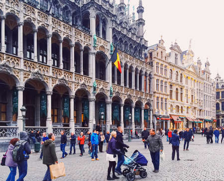 Brussels, Belgium - April 17 : Tourists visit the markt square at day in Brussels, Belgium, Europe on a clouday day with gray skies