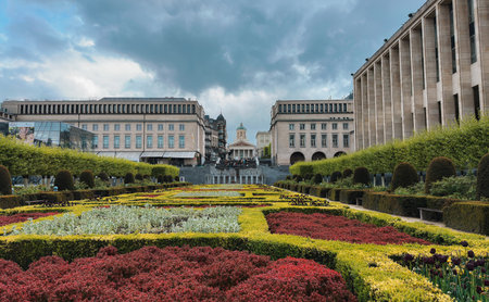 A vibrant and symmetrical view of the Mont des Arts Hill of the Arts garden in Brussels, Belgium