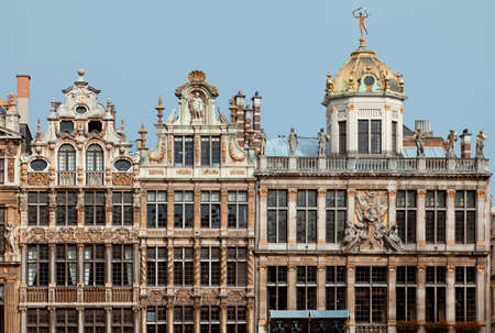 Famous historical buildings of Brussels in Grand Place, against blue sky.