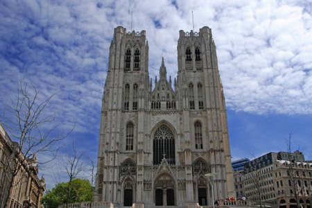Brussels / Belgium - October 2019: Cathedral of St. Michael and St. Gudula - iconic religious landmark. Close up view. Medieval Roman Catholic church with gothic architecture for christian tourism.