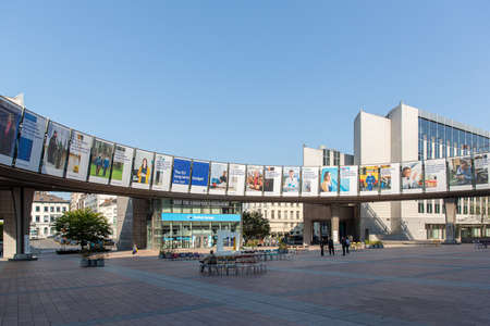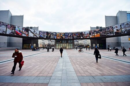 BRUSSELS, BELGIUM - MARCH 16: Wide angle shot with people walking by European Parliament's Leopold Square on March 16, 2016 in Brussels.