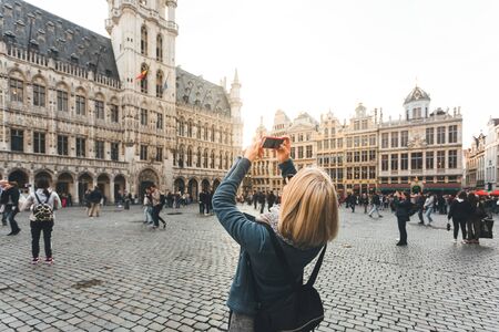 Woman stands in the square Grand Place in Brussels, Belgium at sunset. Photos for Social Networks