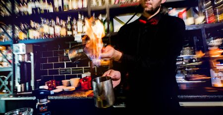 The bartender makes a cocktail with a fire show at the bar. Bartender at work. A restaurant. Nightlife background