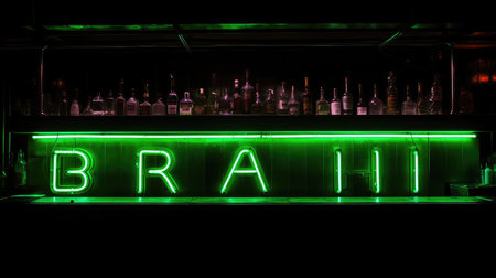 The modern bar illuminated shelves showcase luxury drinks and food generated by artificial intelligence