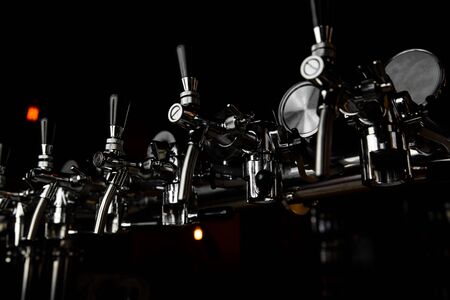 Beer taps bar brewery pints. many beer taps in bar or pub.