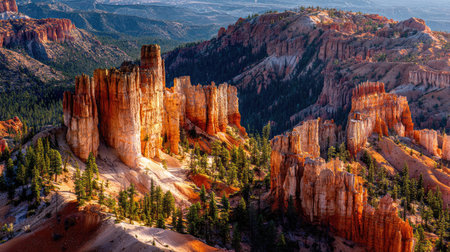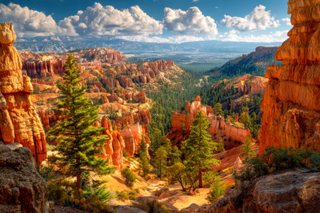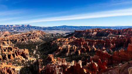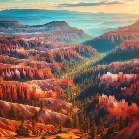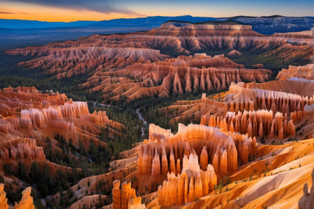 Colorful Utah canyon landscape with towering spires, pines, and vast desert horizons. Bryce Canyon National Park