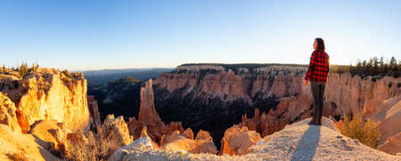Woman enjoying the Beautiful View of an American landscape during a sunny sunset. Taken in Bryce Canyon National Park, Utah, United States of America.