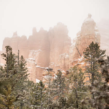 Thick Fog Mixes with Snow Over Bryce Hoodoos and Pine Trees During a winter storm
