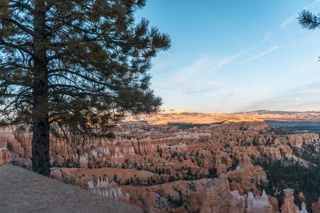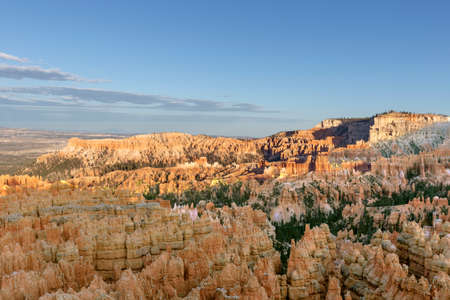 View over the famous Bryce Canyon at sunset, Utah, USA. Bryce Canyon is a collection of giant natural amphitheaters with red, orange and white rocks