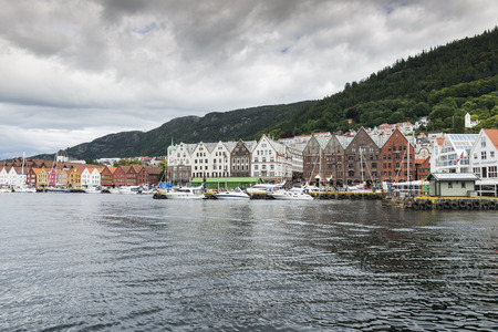 Bergen, Norway- 28 May 2018: View of the Bryggen, series of Hanseatic heritage commercial buildings lining up the eastern side of Vagen harbor.