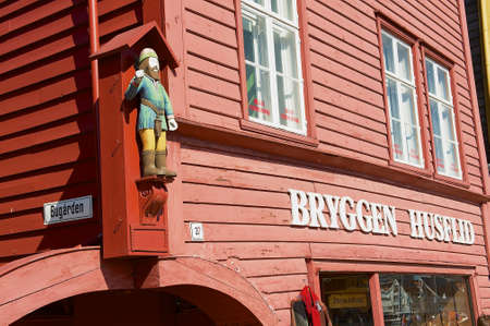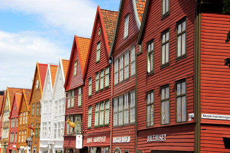 Bergen, Norway - July 06, 2006: Facade of the red painted old wooden building in the historical Bryggen quarter in downtown Bergen, Norway.