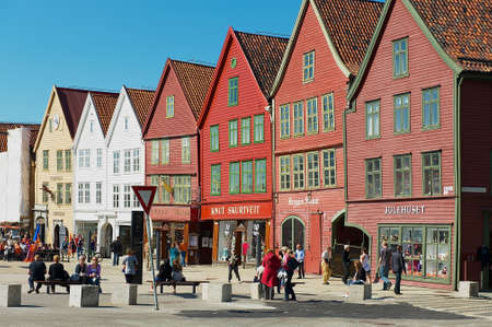 BERGEN, NORWAY - MAY 19, 2014: Colorful wooden houses in the city of Bergen. Bryggen is also known as the Tyskebryggen.
