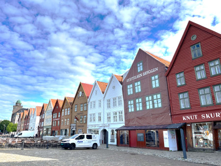 Bryggen, Bergen, Norway - Jun 23, 2023: Hanseatic heritage wooden buildings in the city of Bergen included on UNESCOs World Heritage List