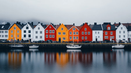 Vibrant houses in shades of red, yellow, and white line the harbor, creating a picturesque view. Boats gently sway in the tranquil water beneath a clouded sky.