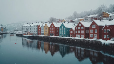 A charming streetscape of a snow-covered Scandinavian village AI generated