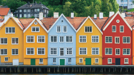 Traditional Scandinavian wooden buildings in vivid colors on Trondheim's waterfront, with the calm sea and blue sky creating a picturesque scene
