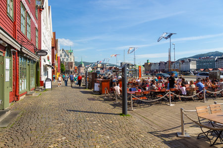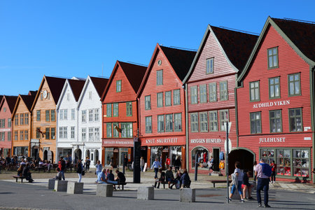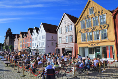 BERGEN, NORWAY - AUGUST 11, 2016: Tourists walking and sitting in front of the famous wooden buildings in Bergen, Norway. The image was taken on August 11, 2016.