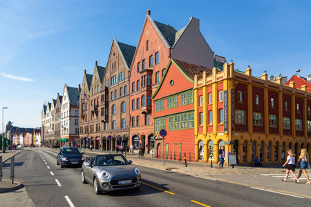 BERGEN, NORWAY - JULY 14, 2022: Bergen is the second largest city in Norway. The ancient picturesque embankment of the city on the coast of the North Sea.