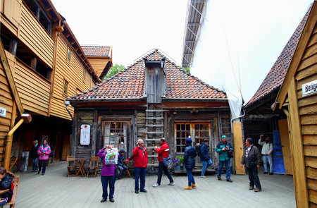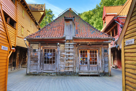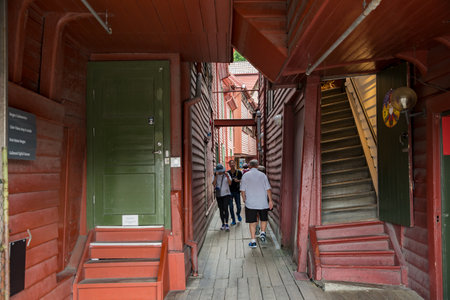Bergen, Norway - July 9, 2024: This ancient wooden building was declared a UNESCO World Heritage City in 1979.