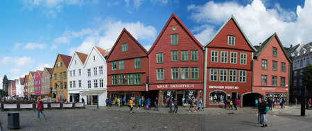 Bergen, Norway - October 2017 : Panoramic view of the colorful houses in the historic Bryggen area in Bergen, site on the World Cultural Heritage list, Norway