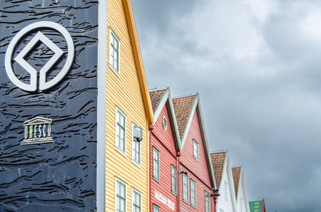 BERGEN, NORWAY - JULY 15, 2014: Colorful facade of the wooden houses of Bryggen, in Bergen, Norway. Bryggen is a UNESCO World Cultural Heritage site since 1979