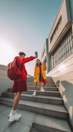 Modern people making video story for social network app outdoor