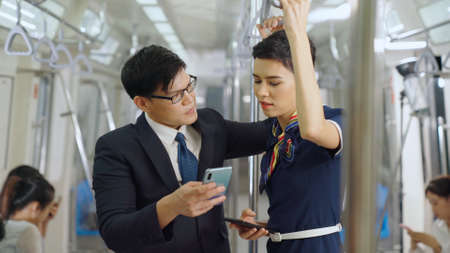 Young people using mobile phone in public underground train . Urban city lifestyle and commuting in Asia concept .