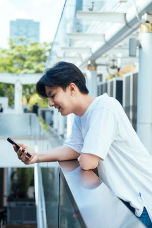 Teenage guy bend down on glasses barricade while use his mobile phone at the terrace.