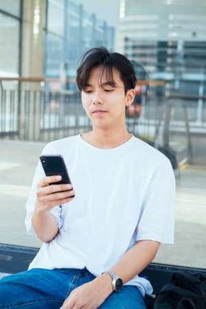 Group of young asian people using mobile smart phone together outdoors.