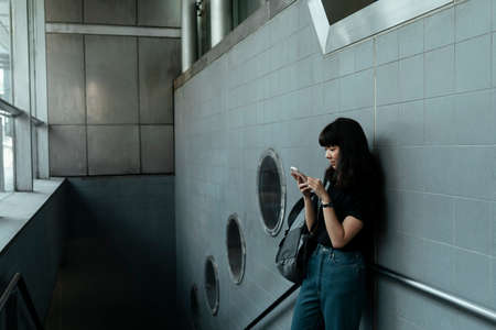 Asian thai backpacker woman using smartphone listen to music with earphones walking out from metro station.