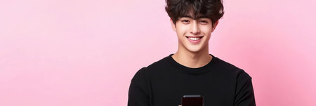 A cheerful young man is engaged with his smartphone, dressed casually against a vibrant pink backdrop.