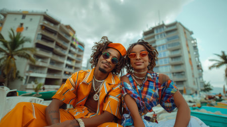 Fashionable young Afroamerican couple lounging by the beach in colorful, trendsetting attire, exuding style and confidence under a cloudy sky.