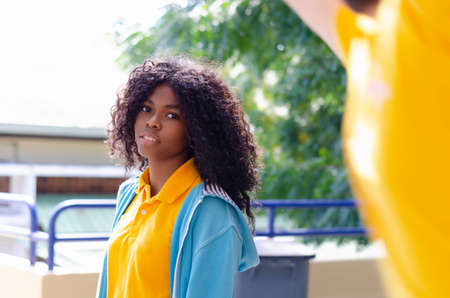 Young black woman 20-25 years old with curly hair in annoyance or dissatisfaction