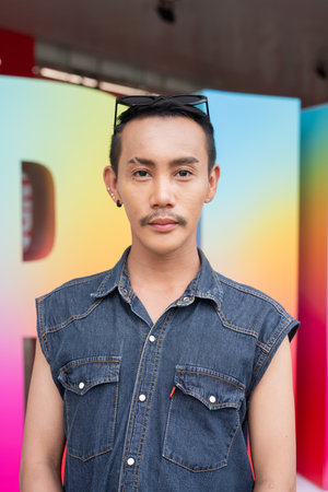 Portrait of Handsome Young Asian Man Against Plain Background Outdoors Concept