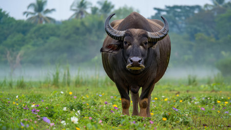 Majestic water buffalo stands in field of tall grass near lake, surrounded by tropical mist. Generative AI.