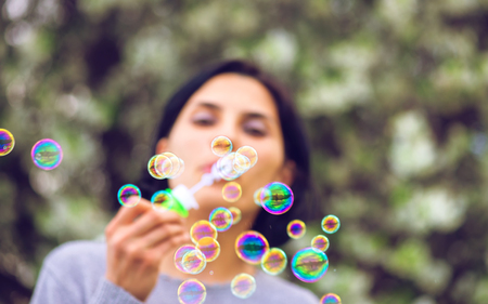 Colorful soap bubbles in the garden with beautiful bokeh.
