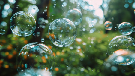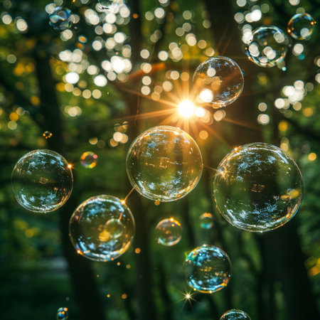 Beautiful soap bubbles in the forest with sun rays and bokeh