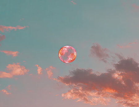 Vibrant, pink sphere is suspended in a pastel-toned sky adorned with soft, fluffy clouds. The colors create a serene and ethereal ambiance, evoking a sense of tranquility and gentle beauty. The image highlights the interplay of light and color, showcasing a peaceful and imaginative scene.