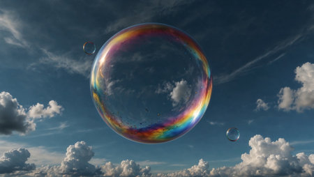 Soap bubbles floating in the air, reflecting the blue sky and clouds