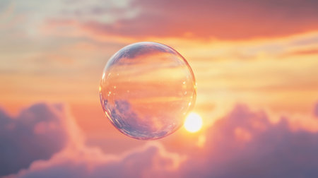 A shimmering soap bubble at sunset, with the sky warm colors mirrored on its fragile surface, floating against a dreamy backdrop.
