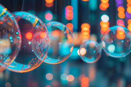 A collection of vibrant soap bubbles hanging elegantly from thin strings, creating a captivating display of colors, A bubble chart representation of volatile stocks, AI Generated